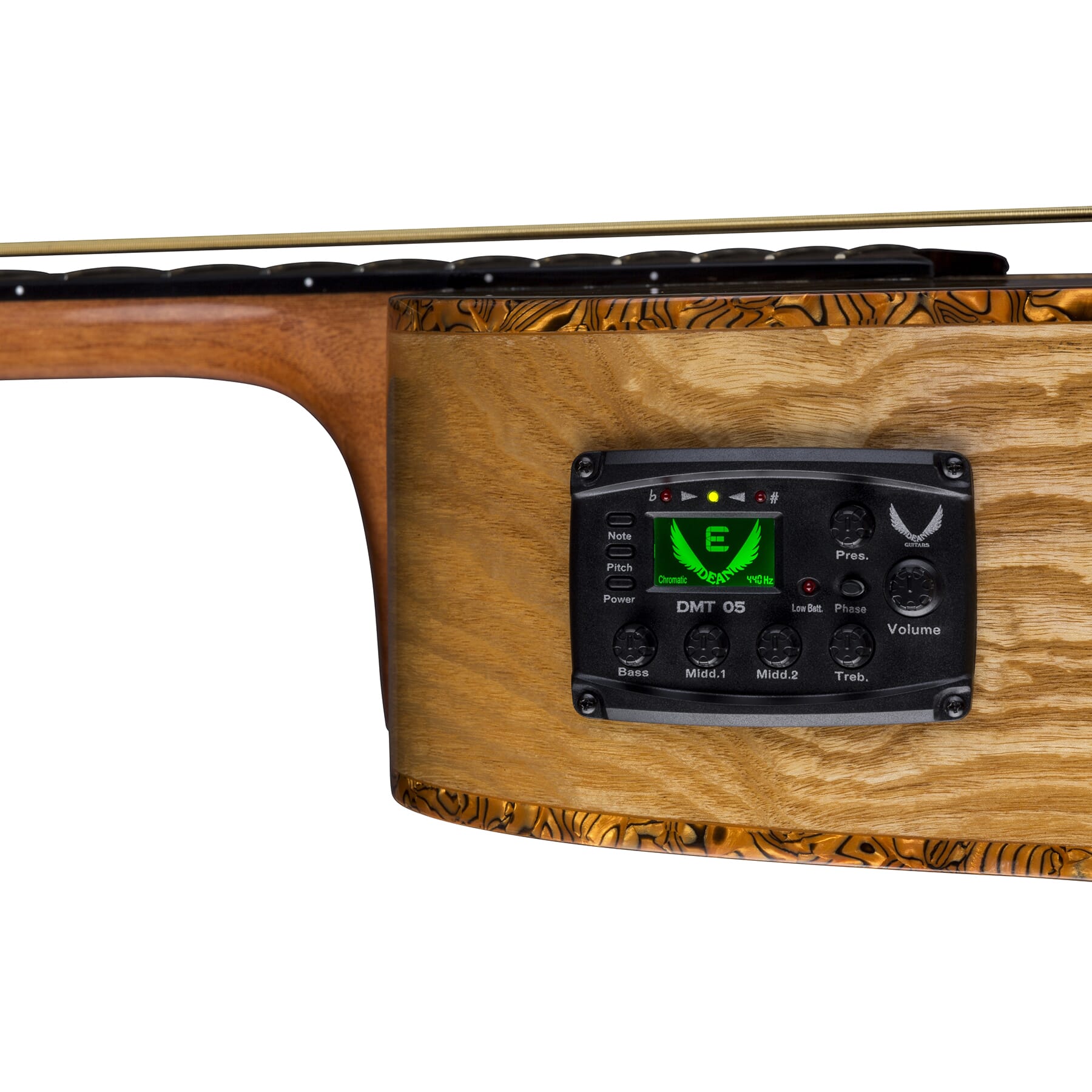 Dean Guitars offers amazing basses at affordable prices! The Exotica Quilt Ash bass is no exception. This 34" instrument comes standard with a gorgeous quilt ash body and top, set neck construction and warm-sounding rosewood fingerboard. Equipped with Dean's new DMT G05 Preamp system you can easily dial in any tonal options you desire. This bass also features an on-board tuner and comfortable D-shaped neck. Extremely affordable and versatile, the Dean Exotica Quilt Ash Acoustic/Electric is a bass you never get tired of playing! Get your wings today!